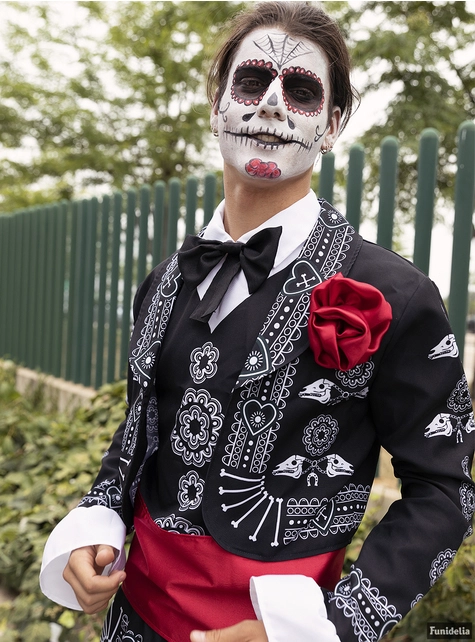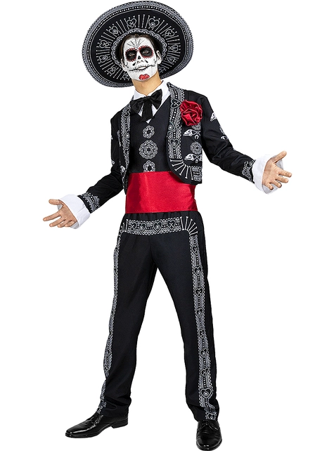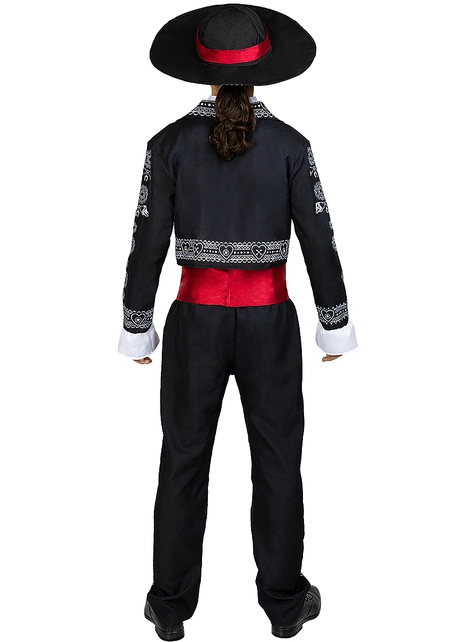 Das Mariachi Kostüm für Herren besteht aus einer Jacke, einem T-Shirt, einer Schärpe, einer Hose und einem Hut, in Schwarztönen mit weißen Details und roten Accessoires. Mit einem gruseligen Halloween Make-up wird daraus ein Mariachi Kostüm zum Tag der Toten.