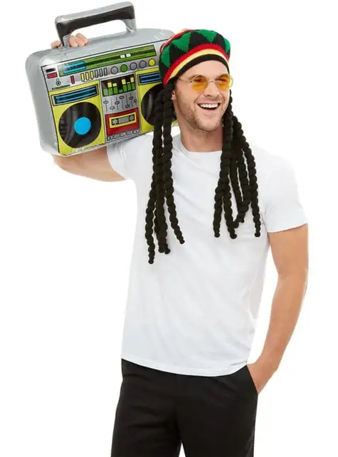 Lieferumfang: Hut mit Rastas, Brille und aufblasbares Radio