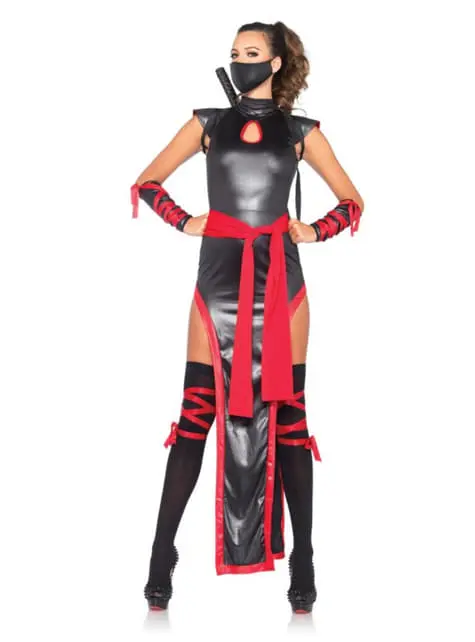 Beinhaltet langes Kleid in Naß-Optik, Gürtel, Armschützer mit rotem Band, lange Strümpfe mit rotem Band und Gesichtsmaske. Schwert ist nicht enthalten.